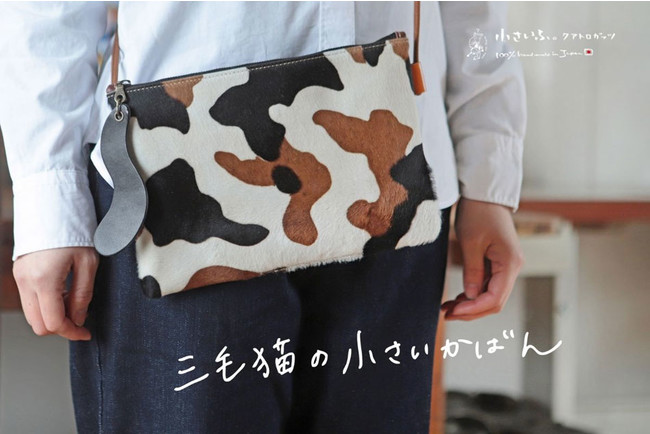牛柄のなかにゆる~いカタチの猫が隠れている遊び心あふれるデザイン。裁断する場所によって柄が違うのもおもしろいポイントです。あなたに届いた小さいふには、猫が何匹かくれているかな?