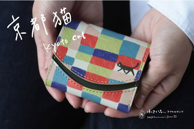 賽の目上の京の町をはんなりお散歩する黒猫が主人公。お財布を開けると中は宇治抹茶カラーと京都づくしです。