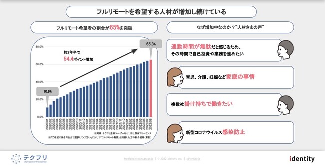 フルリモートを希望する人材の割合は、2020年1月時点で10.9%であったのに対し、2022年8月時点では65.3%と、54.4ポイント増加した。フルリモートを希望する人材の声として、「通勤時間」「家庭の事情」「複業」「感染防止」といったものが挙げられた。