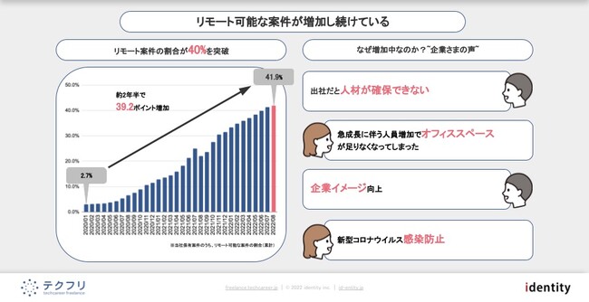 リモート勤務可能な案件の割合は、2020年1月時点で2.7%であったのに対し、2022年8月時点では41.9%と、39.2ポイント増加した。リモート導入に踏み切った企業担当者の声として、「人材確保」「オフィススペース」「企業イメージ」「感染防止」といったものが挙げられた。