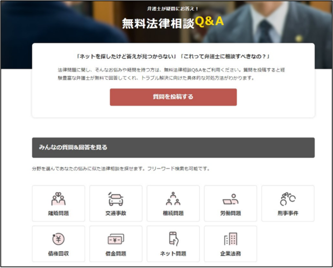 「弁護士ナビシリーズ」では、2021年9月に“無料法律相談Q&A”を実装いたしました。本機能は、ユーザーが無料会員登録をすることで、身近な法律トラブルについて、スマホやPCから気軽に質問を投稿し、「弁護士ナビ」に掲載中の法律事務所所属の弁護士から回答が得られるものとなります。この度、“無料法律相談Q&A”の投稿件数(ユーザーの質問投稿と弁護士の回答投稿の合計)が、5,000件を突破しました。