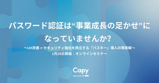 Capy株式会社(本社:東京都千代田区、代表取締役社長:岡田 満雄y) は、無料オンラインセミナー「【再放送】パスワード認証は今や“セキュリティ課題”ではなく“事業成長の足かせ” それでも使い続けますか?~UX改善 × セキュリティ強化 × 成長を実現する『パスキー』導入の現実解~」を2026年1月29日(木)に開催いたします。