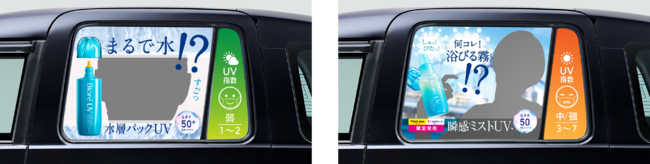 「紫外線情報」には、WxTechサービスの1kmメッシュの「紫外線予報API」を用います。紫外線状況を弱(指数:1~2)、中/強(指数:3~7)の2段階で表示し、紫外線状況に応じた広告クリエイティブを日替わりで掲出します。また、車内でも商品動画を放映する他、対象車両に乗車した女性限定で「ビオレUVアクアリッチ アクアプロテクトローション(通称:水層パックUV)」の試供品を配布し、歩行者だけでなくタクシー利用者に対しても紫外線予防を呼びかけます。