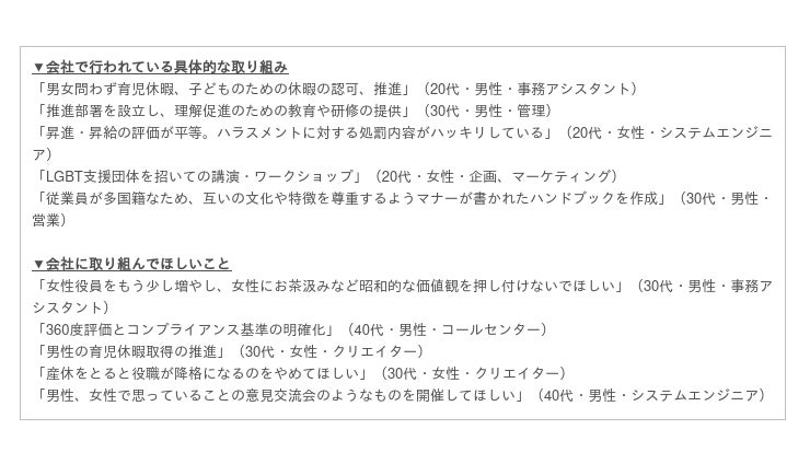 また、対象者に現在(直近)の会社でダイバーシティの推進や男女平等に繋がる取り組みはされているかと聞いたところ、「はい」と答えた人が20.1%、「いいえ」と答えた人が43.3%、「わからない」と答えた人が36.5%となりました。「はい」と答えた人には取り組みの具体的な内容、「いいえ」「わからない」と答えた人には会社に取り組んでほしいことを聞きました。