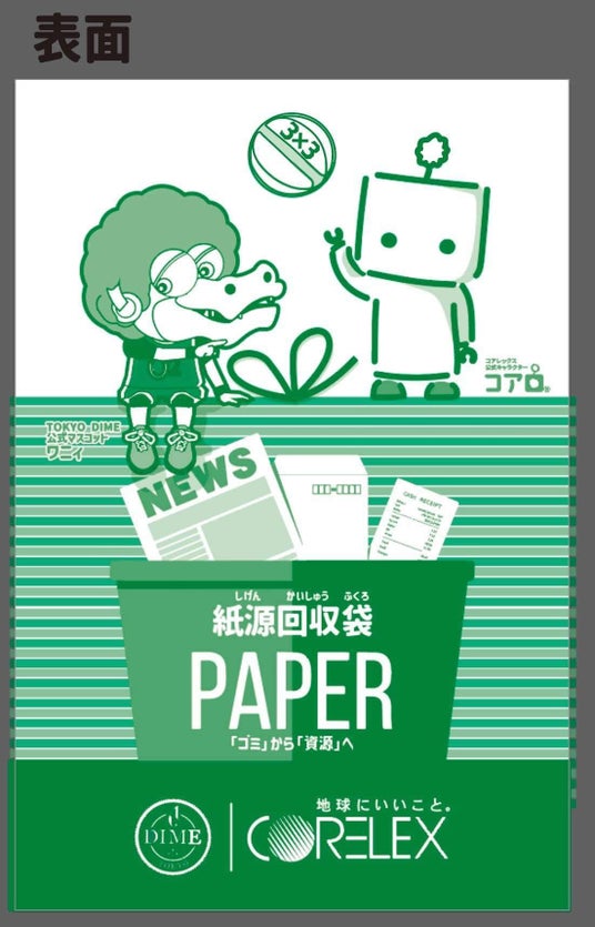 TOKYO DIME公式マスコット「ワニィ」とコアレックス公式キャラクター「コアロ」がデザインされたオリジナルの紙資源回収袋。ワニィに生みの親、ムライタケシ氏による可愛らしいデザインとなっています。
