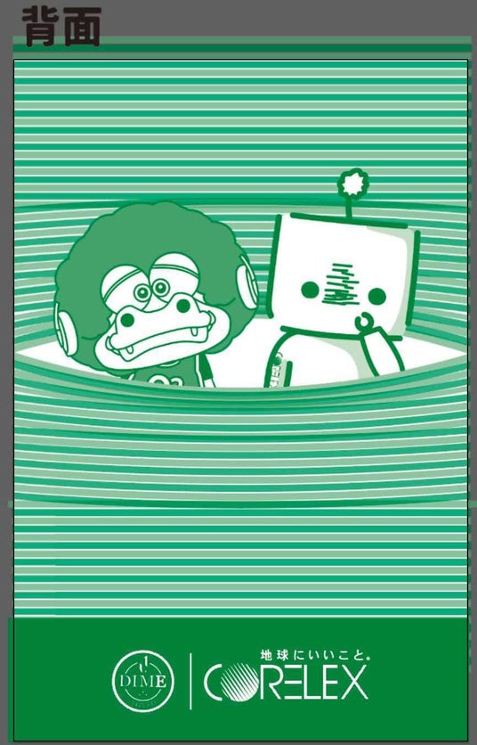 TOKYO DIMEとコアレックス公式キャラクター「コアロ」のコラボデザイン。TOKYO DIMEインターン生の篠原弥風がデザイン。古紙に光が差し込むイメージをデザインに落とし込み、SDGsの推進に繋げたいと考えました。