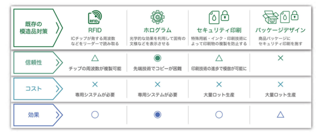 従来のトレーサビリティでは、HyperJシール自体の偽造や、アクセスした先のサイトが不正サイトなどのリスクがありました。また、ブロックチェーンを使った真贋システムは高コストで実用化が困難でしたが、リーガルテック社の新技術は低コストでブロックチェーンを活用した自社専用の真贋判定システム構築が可能になりました。