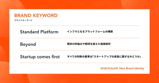 新ブランドキーワード「Standard Platform:インフラとなるプラットフォーム」「Beyond:既存の枠組みや期待を超えた価値提供」「Startup comes first:すべての判断の基準は『スタートアップの成長に繋がるかどうか』」