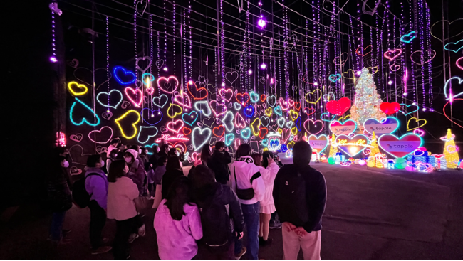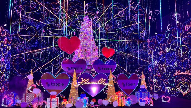 そこで今年初登場した「ハートフルイルミネーション」がタップル仕様に特別ラッピング!散りばめられたハートのイルミネーションに囲まれた空間で、音楽に連動して光り輝くエンターテインメントショーとなり、多くの方にお楽しみいただきました。