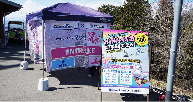 タップルでは「恋愛総量の最大化」をパーパスに掲げ、恋愛を応援し多くの出会いを生み出すために、特設レーンで偶然隣に並んだ男女同士がマッチングして絶叫吊り橋「風天」に挑戦するリアルマッチングイベントを実施しました。