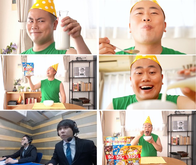 雲一つない青空の元、晴れやかな笑顔でカーテンを開け、窓の外から現れたのは…岡部さん演じる「シスコーン」のキャラクターの男の子“シスコーン坊や”。実況・秋山さん、解説・菊田さんとともに“シスコーン坊や”の朝食シーンを見届けます。“シスコーン坊や”がお皿にそそいだのは、もちろん「シスコーン」。続いて、優雅に満面の笑顔で牛乳を注ぎます。ひとりで朝食の準備ができ、美味しそうに「シスコーン」を頬張る“シスコーン坊や”。そこで発した一言とは・・・?