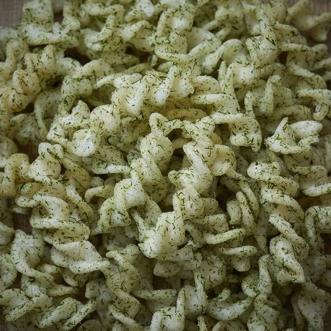 今回新たに誕生したポリフリーの味付けは「のり塩味」と「えびせん風」の二つ。のり塩味には、陸前高田市で陸上養殖されている「すじ青のり」を使用。青のりの中でも最高品種と言われるすじ青のりの香り高さをお楽しみいただけます。えびせん風には、桜えびのようですがプランクトンの一種である「さくらこあみ」を使用。えびの風味を楽しめ、アレルゲンフリーと言う海の恵みの食材です。食べれば分かるその旨みと香ばしさ。三陸の春の味をご堪能ください。