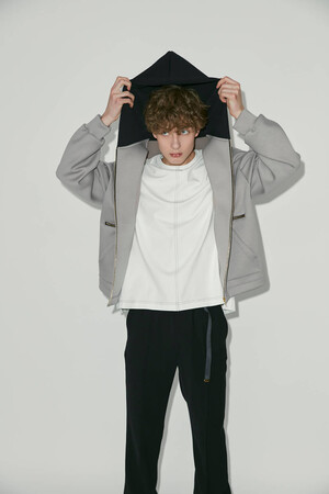 「膨らみ感と上品な光沢感のあるダンボール素材」+「とろみのあるシャツ生地」+「光沢感のあるナイロンツイルのフード」を掛け合わせたアシンメトリーデザインが特徴。