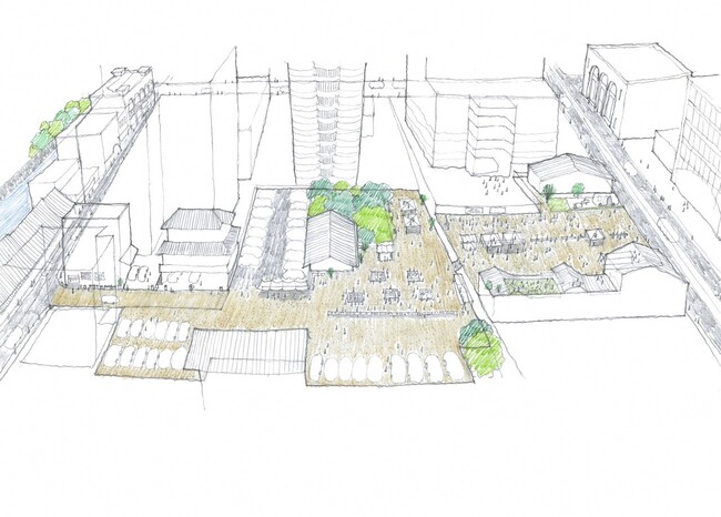 150mの延長を活かし、テーブルや椅子を多数配置することで、ロジを浮かび上がらせ、来街者にロジの存在や空間を体感してもらいます。当地の歴史や魅力を紹介するサインや動画放映によりロジへの流入を誘発します。空間の広さや周辺の施設配置や日陰の位置等の特性を踏まえ、人工芝、植栽、日陰テント等の配置により佇みたくなる空間を提供します。