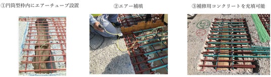 こうした補修の課題に対応するため、栗本鐵工所はエアーチューブを内包したコンテナバッグ外皮の本製品を使用することで、特殊な機材を持ち込むことなく誰でも簡単に床版内に円筒型の中空部を再形成し、補修用コンクリートが打設できる「エアーチューブ工法」を確立しました。