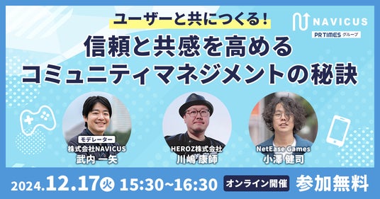 国内外のゲーム事業会社様のファンコミュニティ作りを、SNSを通じてご支援している株式会社NAVICUS(本社:東京都千代田区、代表取締役:武内 一矢、以下:NAVICUS)は、2024年12月17日(火)に無料ウェビナー「ユーザーと共につくる!信頼と共感を高めるコミュニティマネジメントの秘訣」を開催いたします。