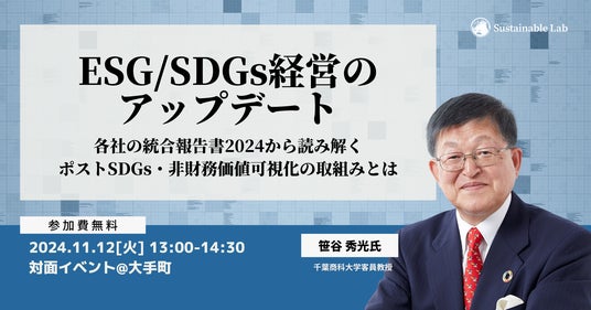 ESGデータの集計・管理・分析ツール「TERRAST for Enterprise」「TERRAST for Management」や財務・非財務データ分析支援を提供するサステナブル・ラボ株式会社(本社:東京都千代田区、代表取締役:平瀬錬司、以下「当社」)は、11/12(火)にESG経営における非財務価値可視化や企業価値向上に関するイベントを大手町にて開催いたします。