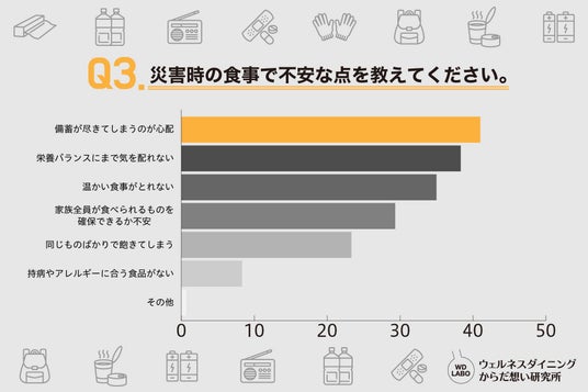 最も多かったのは「備蓄が足りなくなる心配」(41.0%)、次いで「栄養バランスまで気を配れない」(38.3%)、「温かい食事がとれない」(35.0%)が続きました。