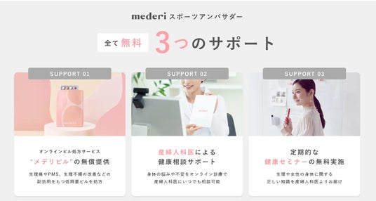 mederiスポーツアンバサダーに採用された女子スポーツチームには、2023年から約1年間、選手への個別オンラインピル処方、産婦人科医による健康相談サポートのほか、年4回実施予定の健康セミナーなど、選手・指導者双方がご参加いただけるプログラムを無償でご利用いただける特典を提供いたしました。