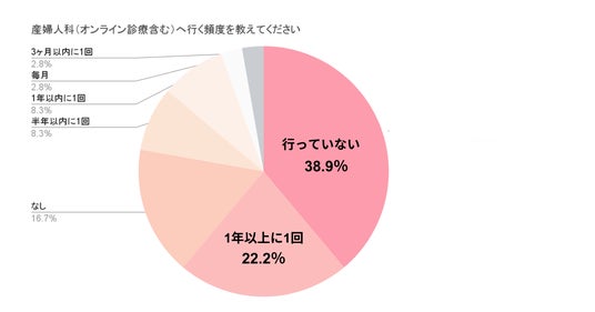 産婦人科へ行く頻度については、「行っていない(38.9%)」「1年以上に1回(22.2%)」が合わせて6割以上を占める。