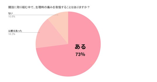 「競技に取り組む中で、生理時の痛みを我慢することはありますか?」という項目では、「ある(73%)」「以前はあった(16.2%)」が合わせて9割近くという結果に。