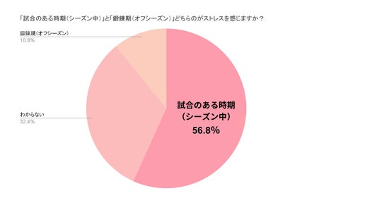 ストレスは、「鍛錬期(オフシーズン)(10.8%)」よりも「試合のある時期(シーズン中)(56.8%)」の方が強く感じる人が多いという傾向がある。