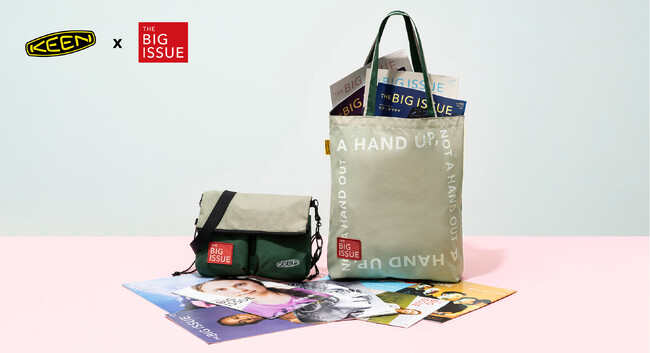 2003年の創業以来、社会貢献を経営の礎とするアウトドア・フットウェアブランド 『KEEN(キーン)』 は、ホームレス状態からの社会復帰をサポートする雑誌 『THE BIG ISSUE (ビッグイシュー)』 との、チャリティ・コラボバッグ2種(サコッシュとトートバッグ)を2023年8月15日に発売いたします。ともに工場に残った素材を有効活用し、アップサイクルした本製品は、路上でビッグイシューの販売者さんから直接購入すると定価の約40%が販売者さんへの収入となり、KEEN 直営店および、公式オンライン(https://www.keenfootwear.jp/)などでの購入分も収益の一部がビッグイシューへ寄付されます。