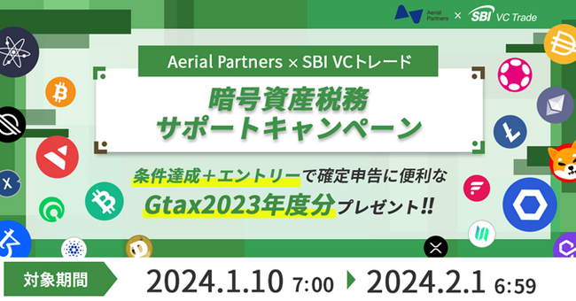 SBI VCトレード株式会社(本社:東京都港区、代表取締役社長:近藤 智彦、以下「当社」)は、株式会社Aerial Partners(本社:東京都港区、代表取締役:沼澤 健人)と協同して、2024年1月10日(水)より、「Aerial Partners × SBI VCトレード 暗号資産税務サポートキャンペーン~確定申告に便利なGtax2023年度分プレゼント~」を実施することをお知らせいたします。