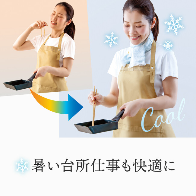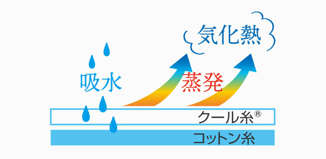 冷感度約3倍の特殊冷感「クール糸(R)」としっかり汗を吸水するコットンの裏地で、気化熱を効率よく発生させるガーゼの構造に。※比較対象:綿、製造元調べ