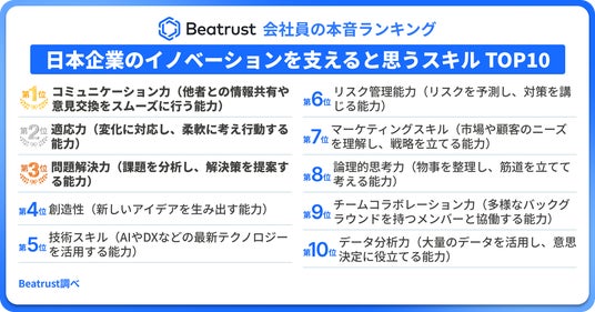 Beatrust株式会社(本社:東京都、CEO:原 邦雄、以下「Beatrust」)は、会社員1,000人を対象に「日本企業のイノベーションを支えると思うスキル」に関する意識調査を実施し、そのランキングデータを公開しました。