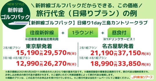 株式会社ジェイアール東海ツアーズ(本社:東京都中央区、以下JR東海ツアーズ)は、新企画のEX旅パック「新幹線ゴルフパック」を発売致しました。「往復新幹線+三島カントリークラブ1ラウンドプレイ+昼食+1ドリンク」がセットになった宿泊プランと日帰りプランが、気軽にゴルフをお楽しみいただけるようお得な価格で登場します。新幹線で行くから渋滞の心配は一切なし!運転があるからお酒が飲めない、そんな悩みも心配ご無用!帰りは静岡ご当地グルメを楽しみながら宴会などの新しい楽しみ方も。富士山と駿河湾の眺望が美しい三島カントリークラブで、感動のゴルフ体験をお楽しみください。
