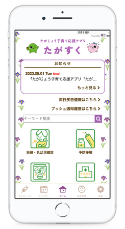 多様化する子育て世代のニーズへの対応と行政サービスのDX推進の一環として、たがじょう子育て応援アプリ「たがすく」を導入しました。子育て支援情報をタイムリーに受信でき、母子健康手帳の成長記録や乳幼児健診のデジタル記録を家族間で共有できるほか、予防接種のスケジュール管理などの便利な機能もございます。