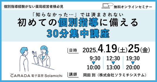 クラウド電子薬歴『CARADA 電子薬歴 Solamichi』の企画・開発・販売を行う株式会社ソラミチシステムは、無料オンラインセミナー【「知らなかった…では済まされない!」初めての個別指導に備える30分集中講座】を4月19日(土)、25日(金) に 開催します。