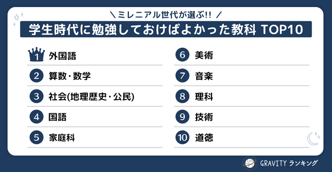 今回のテーマは、ミレニアル世代が選ぶ!!「学生時代に勉強しておけばよかった教科TOP10」