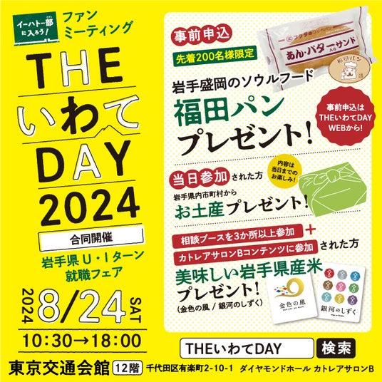岩手県では、U・Iターンの促進を目的とし、8月24日(土)に東京有楽町・東京交通会館で岩手県主催移住フェア「THEいわてDAY 2024」を実施します。