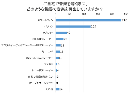 「ご自宅で音楽を聴く際に、どのような機器で音楽を再生していますか?」という質問に対しては、「スマートフォン」が232票を集め、「パソコン」124票、「タブレット」40票が続く結果となりました。
