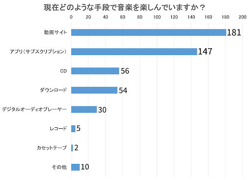 「現在どのような手段で音楽を楽しんでいますか?」という質問に対しては、「動画サイト」が181票を集め、「アプリ(サブスクリプション)」141票、「CD」56票、「ダウンロード」54票、「デジタルオーディオプレーヤー」30票が続く結果となりました。
