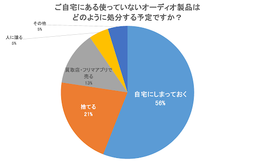 「ご自宅にある使っていないオーディオ製品はどのように処分する予定ですか?」という質問に対しては、56%が「自宅にしまっておく」と回答し、「捨てる」21%、「買取店・フリマアプリで売る」13%が続く結果となりました。