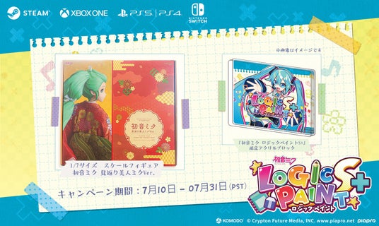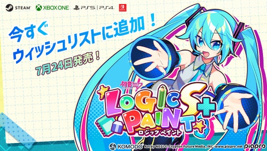 7月24日 -KOMODOとクリプトン・フューチャー・メディア株式会社は、『初音ミク ロジックペイントS+』を複数のプラットフォームで世界同時発売することをお知らせいたします。本作は、7月24日にSteam、Nintendo Switch、XBOX One、PlayStation 4、PlayStation 5にてリリースされます!