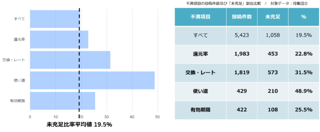母集団2.を対象に、不満項目別の投稿件数と「未充足」割合を比較した。投稿件数は「還元率」「交換・レート」が上位となった。「未充足」の割合は、全体平均が19.5%であったのに対し、全ての不満項目でそれを上回った。