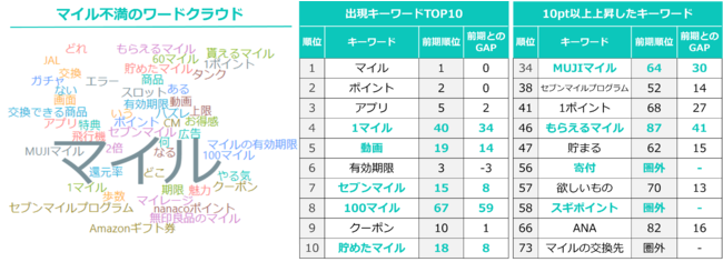 ランキングで新たにTop10入りしたものは「1マイル」「動画」「セブンマイル」「100マイル」「貯めたマイル」。10pt以上順位を上げたキーワードの中でも特に顕著なものは、「MUJIマイル」「もらえるマイル」「寄付」「過ぎポイント」となった。
