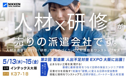 多様な人材を人的資本と捉え、人材ソリューションで可能性を創造する「人的資本創造企業」の日研トータルソーシング株式会社(本社:東京都大田区)は、5月13日(水)~15日(金)にインテックス大阪で開催される「第2回 製造業 人手不足対策EXPO(大阪)-人材の採用・教育・管理展-」に出展いたします。