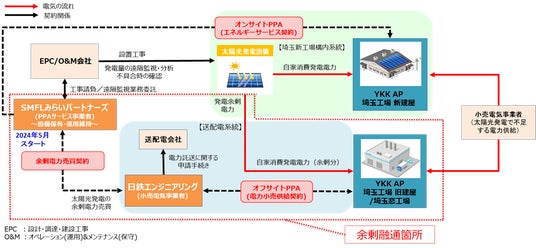 YKK AP株式会社(代表取締役社長:魚津 彰)、日鉄エンジニアリング株式会社(代表取締役社長:石倭 行人)、三井住友ファイナンス&リース株式会社(代表取締役社長:橘 正喜)の戦略子会社、SMFLみらいパートナーズ株式会社(代表取締役社長:上田 明)の3社は、オンサイト型太陽光発電エネルギーサービス(以下「オンサイトPPA※1」)の新たなスキームとなる「発電余剰電力融通型オンサイトPPA」の運用を2024年5月に開始し、YKK AP埼玉工場新建屋で発電される再エネ電力を、YKK APの別の2施設(埼玉工場旧建屋および埼玉窓工場)へも託送供給することで、埼玉工場新建屋に設置された太陽光発電設備から供給される再エネ電力を100%有効活用する体制を整えました。