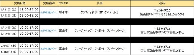 ※開催場所の調整状況や新型コロナウィルスの感染状況等により、「出張申請受付」及び「出張申請サポート」の開催を中止・延期、または実施内容が変更となる可能性がございます。