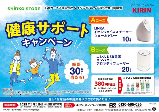 兵庫県尼崎市に本社を置くオフィスコンビニ設置・運営の心幸サービス株式会社(本社:兵庫県尼崎市、代表取締役:山崎 忠、以下「心幸サービス」)は、全国約200店舗の従業員専用コンビニ「心幸ストア」にて、キリンビバレッジ株式会社 近畿圏統括本部(統括本部長 有馬正剛)と共同で、ライフスタイル応援グッズをプレゼントする「健康サポートキャンペーン」を、2025年1月6日(月)から2月28日(金)までの期間限定で実施いたします。