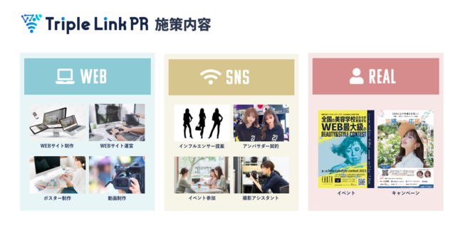 SNS集客のプロ集団「crea社」と、リアルイベント・キャンペーンのプロフェッショナル集団「Next Relation社」と連携し、低価格+即日対応を可能にした『WEB×SNS×リアル』の3つをリンクした最強のPR集客施策。