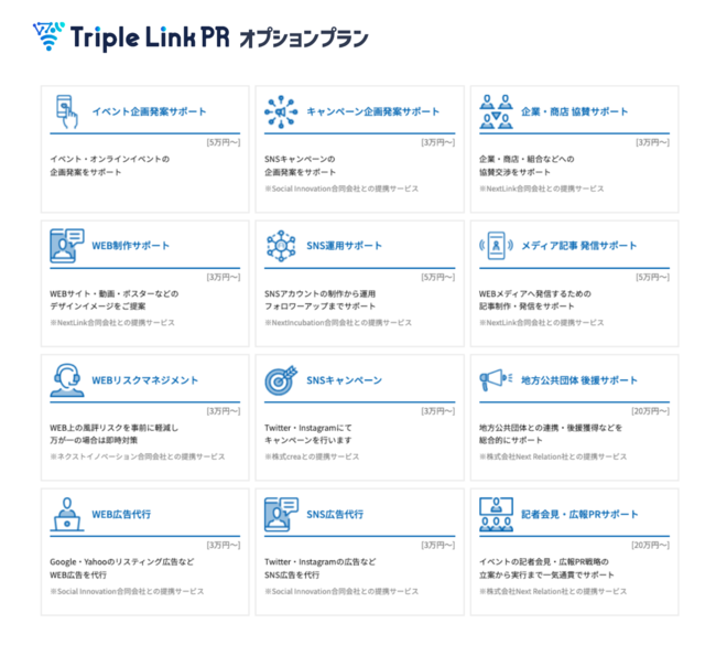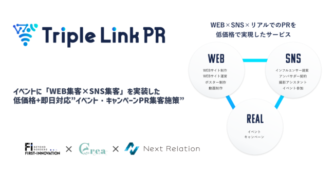 東京都中央区のIT企業『株式会社ファーストイノベーション』(代表取締役社長:木ノ根 雄志、以下ファーストイノベーション)は、イベントに「WEB集客×SNS集客」を実装した低価格+即日対応"イベント・キャンペーンPR集客施策"「トリプルリンクPR」を株式会社Next Relation(本社:東京都中央区、代表取締役CEO:小野寺 浩太、以下Next Relation)と株式会社crea(本社:東京都中央区、代表取締役社長:荻野 彩、以下crea)など6社と事業提携し、12個のオプションプランの追加を行いました。
