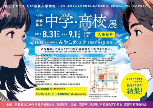 京都府私立中学高等学校連合会と京都新聞は、8月31日(土)と9月1日(日)に、小学生・中学生および保護者の皆さんを対象とした「第38回京都私立中学・高校展」をみやこめっせ(京都市勧業館、京都市左京区岡崎成勝寺町)で開催します。資料参加を含め京都府内の私学37校が参加する入試・入学相談会です。入学試験や学校生活について各校入試担当者に直接質問できるほか、本展参加校のパンフレットの配布、京都府の就学支援制度相談コーナー、書籍販売コーナーも設けています。予約不要で、入退場自由です。お気軽にお越しください。