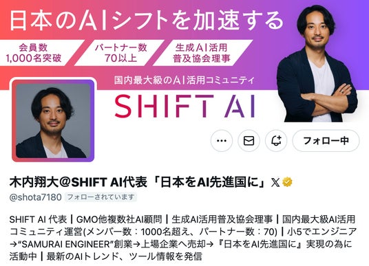 株式会社SHIFT AI 代表取締役 / 一般社団法人生成AI活用普及協会 理事 / GMO AI&Web3株式会社 AI活用顧問 / GMO AI&ロボティクス商事 AI活用アドバイザー