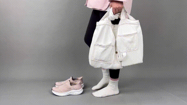 この1秒で履けるシューズは、手や靴べらでかかとを押さえずに足を入れるだけで、かかとを潰すことなく、特殊なかかとに足が滑り、そのままきちんと靴が履けた状態になります。荷物を持ちながらでも屈まずにしっかりと靴が履けます。